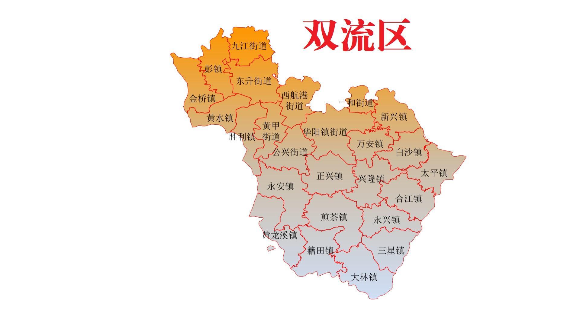 双流区行政区总面积1065平方千米,共辖15个街道、4个镇;去除成都高新区、天府新区代管的镇(街道),实际管辖面积466平方千米, 实际管辖5个街道(东升街道、西航港街道、黄甲街道、怡心街道、九江街道)、4个镇(彭镇、黄水镇、永安镇、黄龙溪镇);中和街道由成都高新区代管,华阳街道、万安街道、正兴街道、兴隆街道、煎茶街道、新兴街道、籍田街道、太平街道、永兴街道等9个街道由四川天府新区代管。 截至2022年末,双流区常住人口150.11万人。