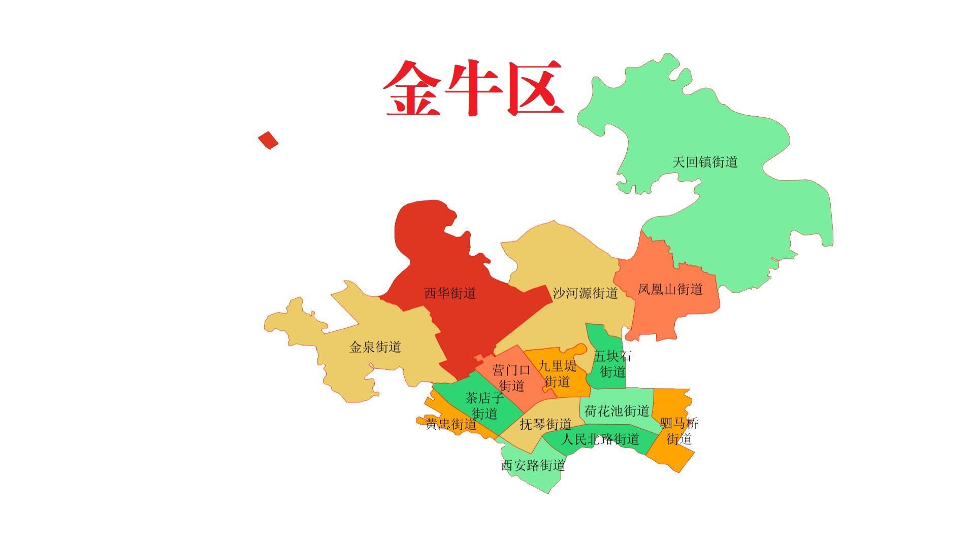 金牛区,区政府驻抚琴街道。位于成都中心城区北部,东临成华区,南、西南连青羊区,西北毗邻郫都区,东北与新都区相连。
