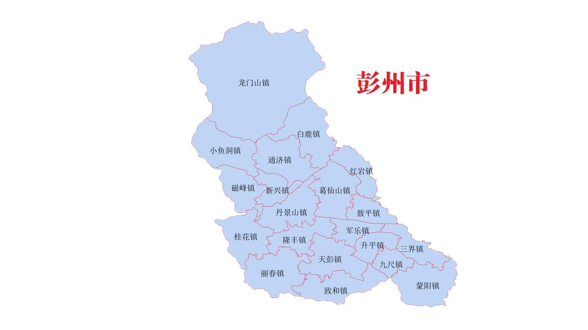 彭州市总面积1421.43平方千米,辖4个街道(天彭街道、隆丰街道、濛阳街道、致和街道)、9个镇(通济镇、丹景山镇、敖平镇、龙门山镇、丽春镇、九尺镇、桂花镇、白鹿镇、葛仙山镇)。截至2022年末,彭州市常住人口78.01万人。