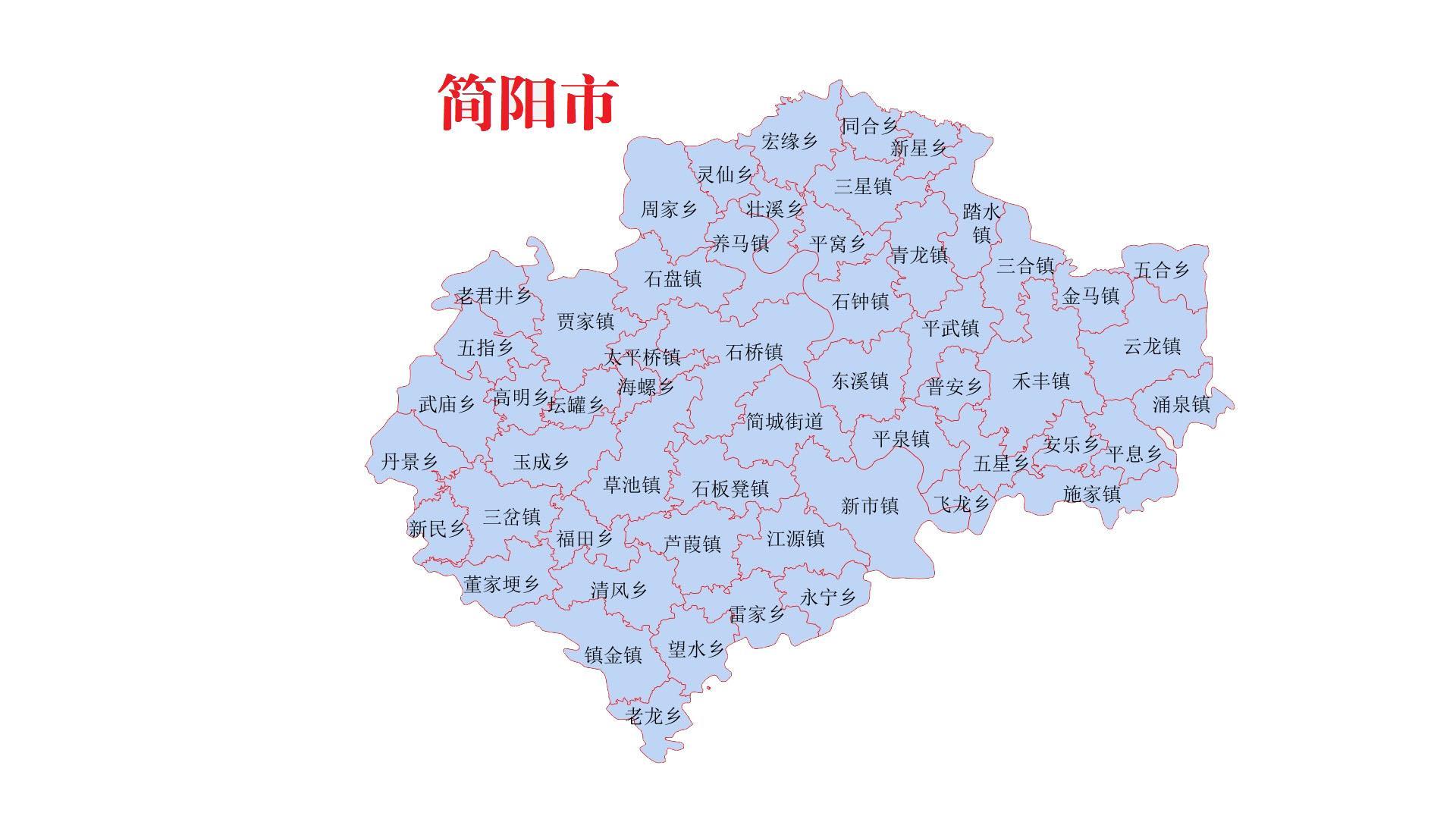简阳市总面积2213.52平方千米,共辖16个街道、21个镇,其中直辖7个街道(射洪坝街道、简城街道、赤水街道、新市街道、东溪街道、平泉街道、石桥街道)、15个镇(三星镇、踏水镇、青龙镇、镇金镇、江源镇、杨家镇、石钟镇、施家镇、禾丰镇、三合镇、平武镇、云龙镇、涌泉镇、宏缘镇、雷家镇),由东部新区代管9个街道(石盘街道、养马街道、贾家街道、石板凳街道、三岔街道、草池街道、福田街道、玉成街道、丹景街道)、6个镇(芦葭镇、高明镇、武庙镇、壮溪镇、董家埂镇、海螺镇)。截至2022年末,简阳市户籍人口149.65万人。