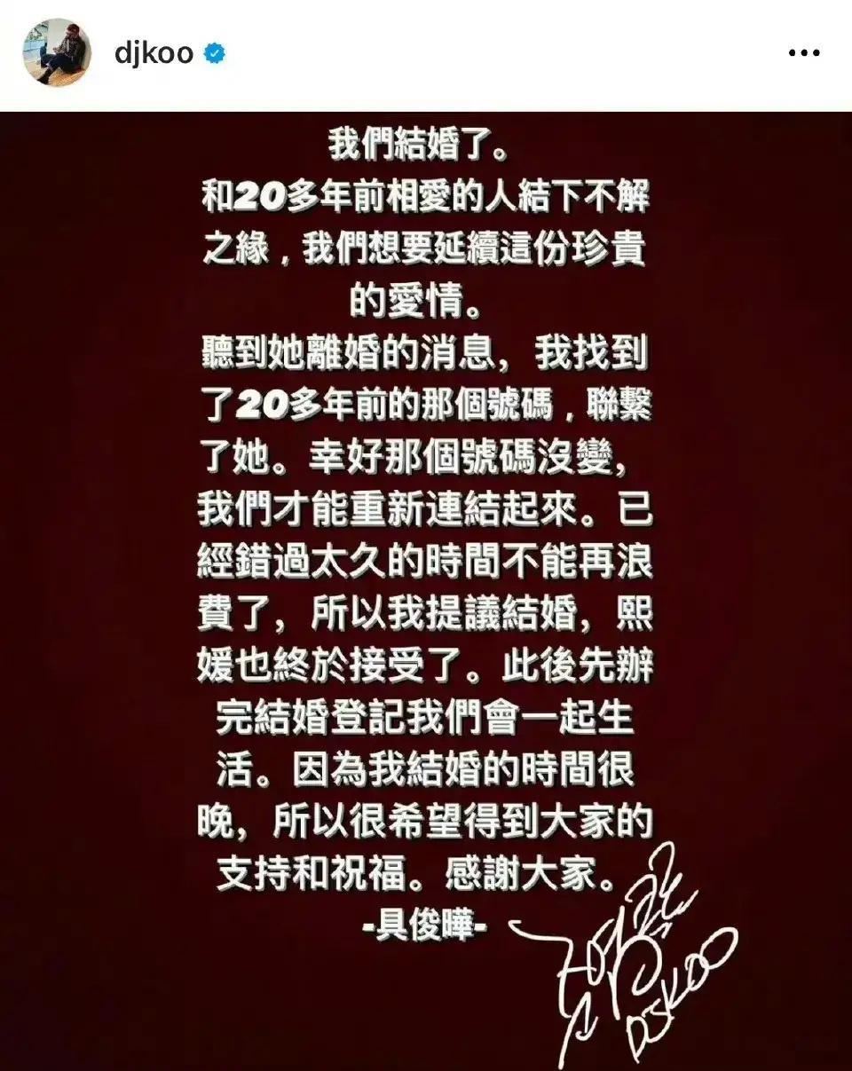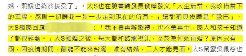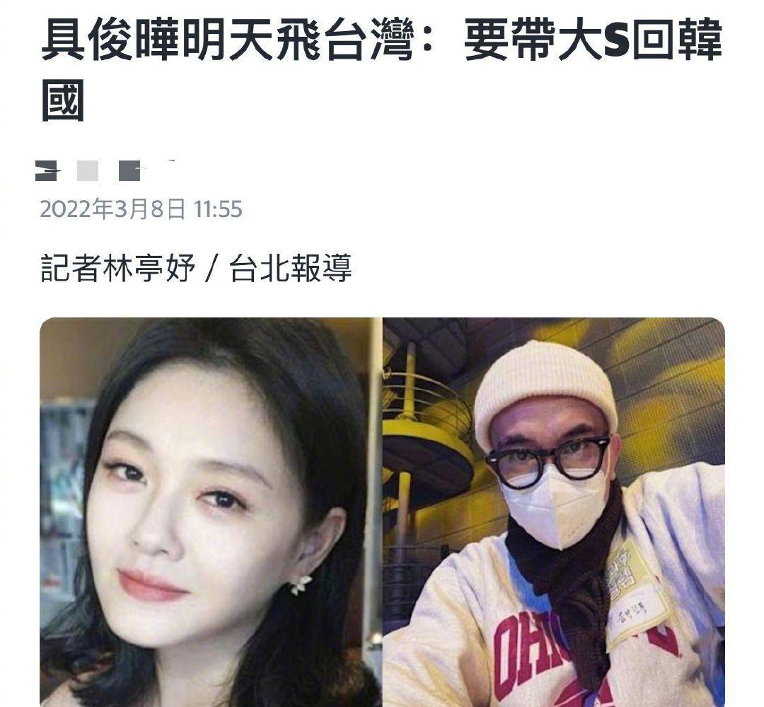 根据具俊晔的采访透露,他与大S已经20多年没见,明天他就会飞到台北,隔离结束后会再在台北进行结婚登记,待两个月,再与大S一起返回韩国。