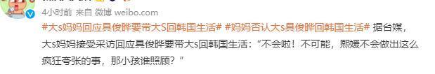 不过大S的妈妈对记者否认了大S将到韩国生活,她表示:“不会啦!不可能,熙媛不会做出这么疯狂夸张的事情,那小孩谁照顾?”