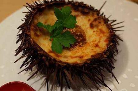3.油煎海胆:取海胆卵肉,加配料,兑蛋清、淀粉,用明火油煎即可。