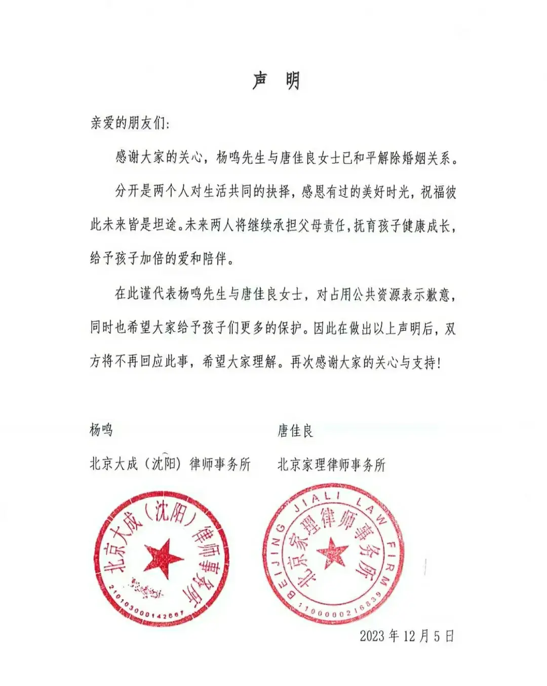 2023年5月10日,杨鸣在微博上发布长文,宣布与妻子离婚。文中他提到了两人曾经的恩爱和家庭生活的美好,但也无法掩盖他们感情破裂的事实。杨鸣表示,他们已经尽力挽回,但最终还是无法回到过去。这一消息迅速引爆社交媒体,网友们纷纷表达惋惜和遗憾。