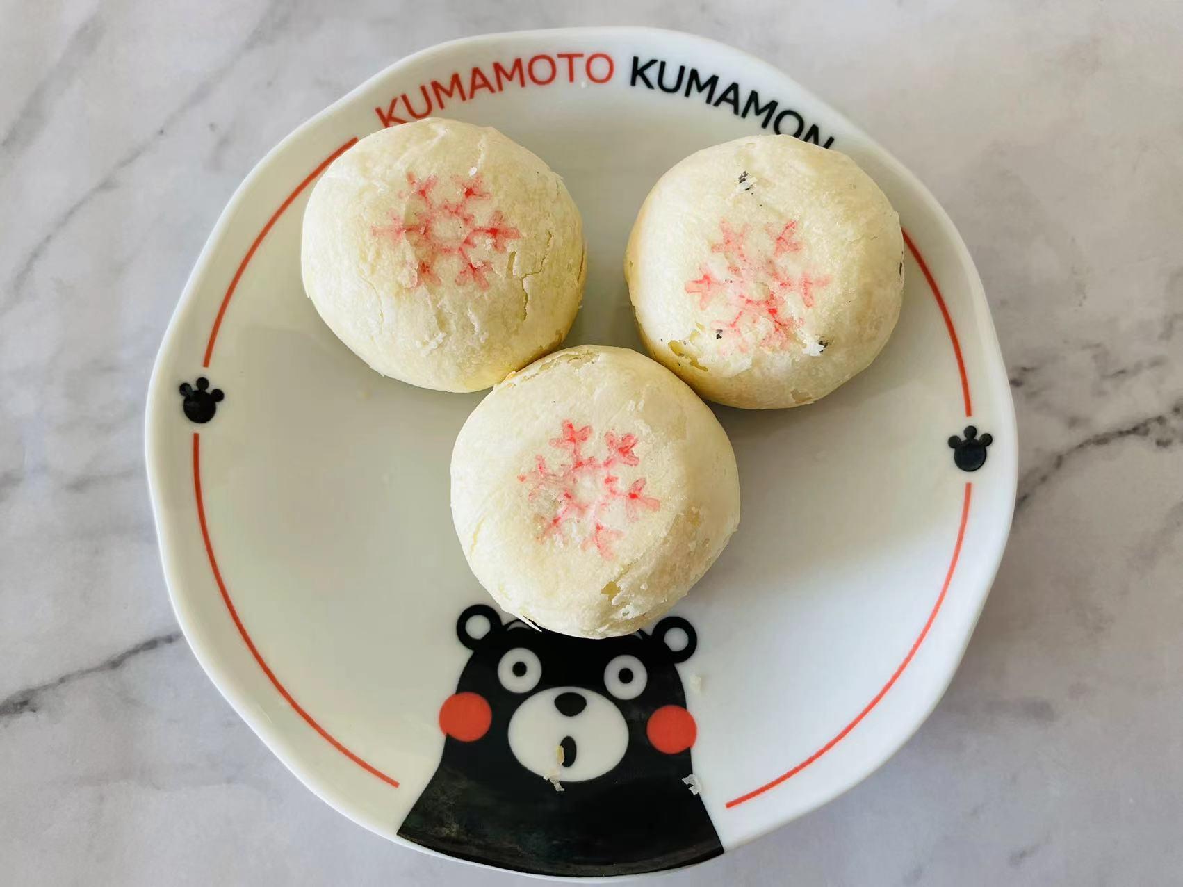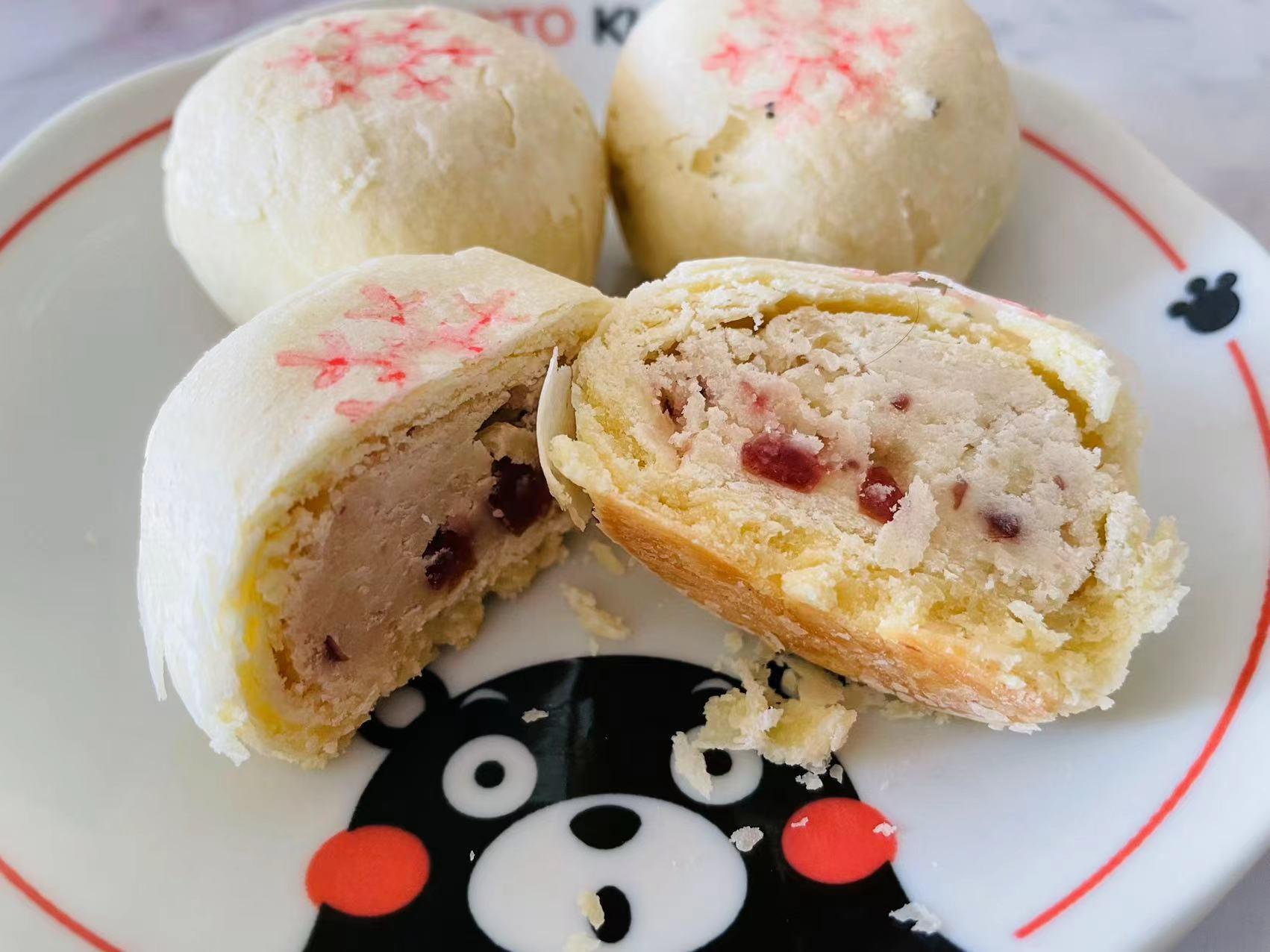好看的白色花朵酥皮。包裹着枣泥馅料,加上红色的点缀,好看又好吃呢,枣泥馅料特别细腻。买了3块7.48元。