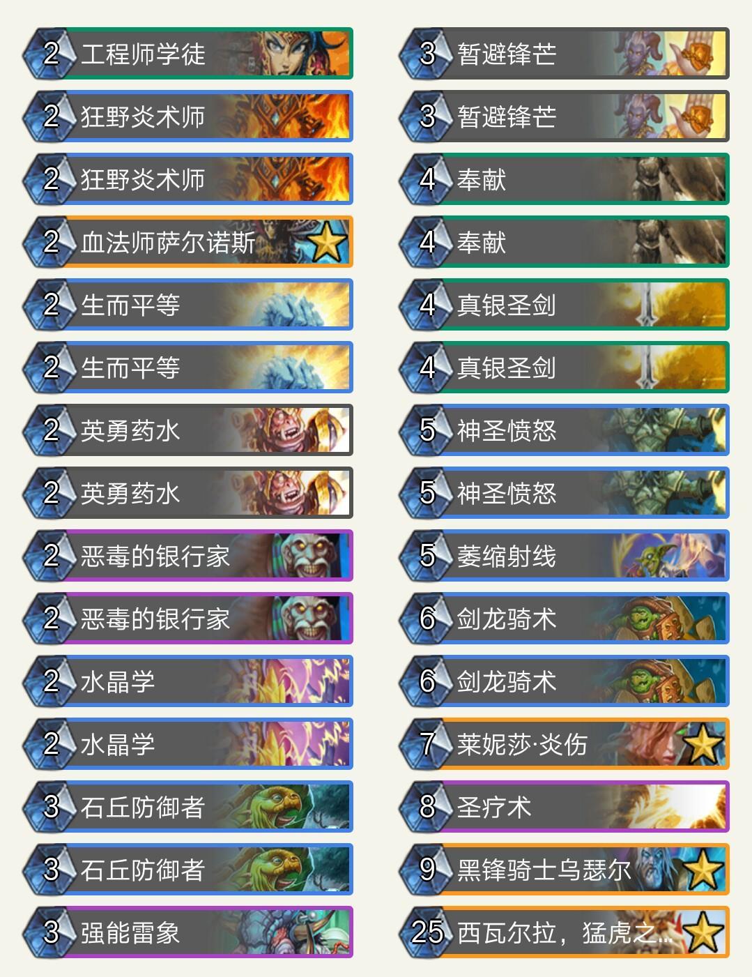 再来就是新版本的otk猛虎骑,通过各种过牌过穿牌库,使用各种法术把猛虎减到低费,然后猛虎+雷象+银行家*2,洗入四只老虎,下回合两个神圣愤怒,斩杀线高达50.