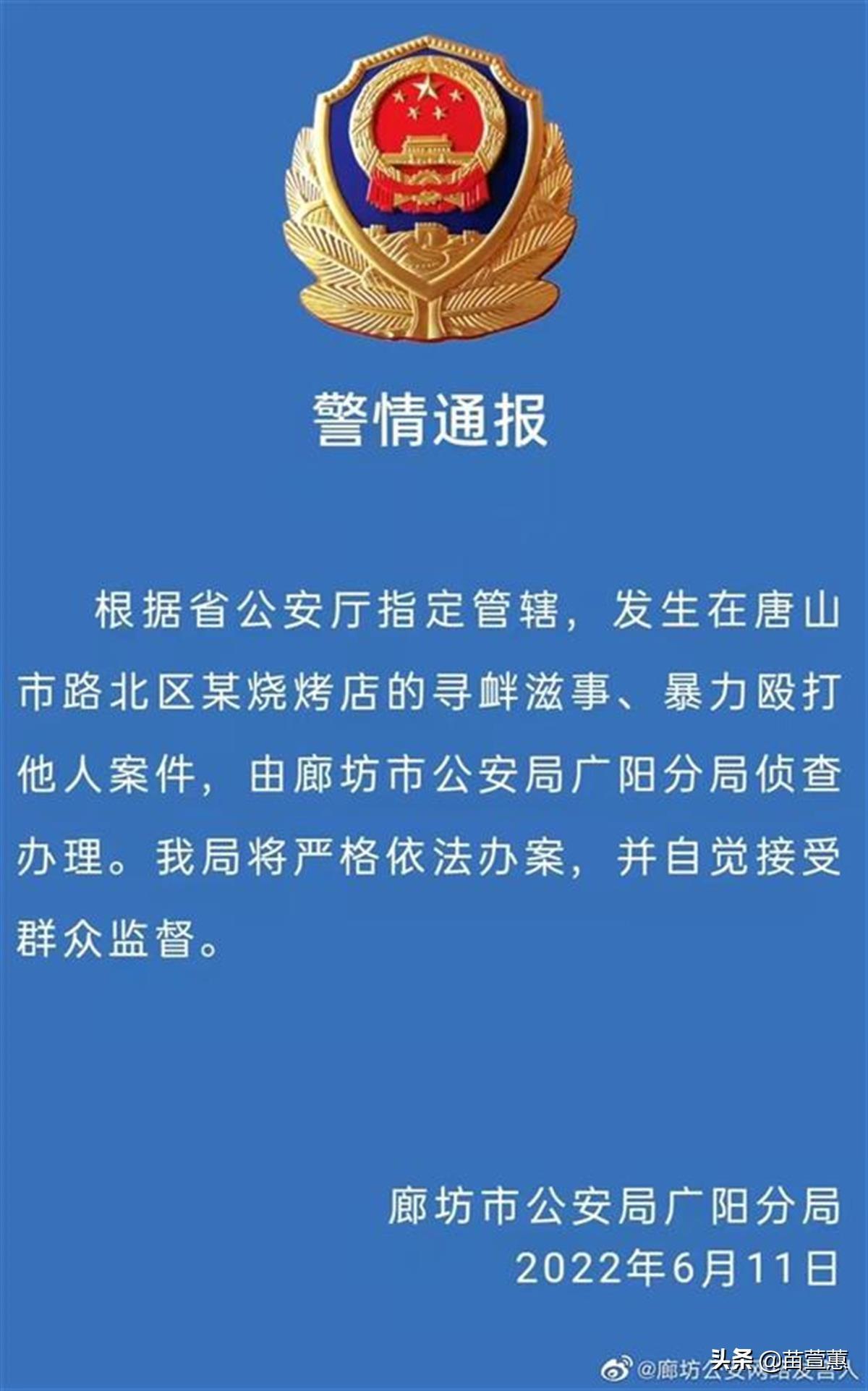 6月11日晚,按照河北省公安厅指定管辖,由廊坊市公安局广阳分局侦查办理唐山烧烤店寻衅滋事、暴力殴打他人的案件。