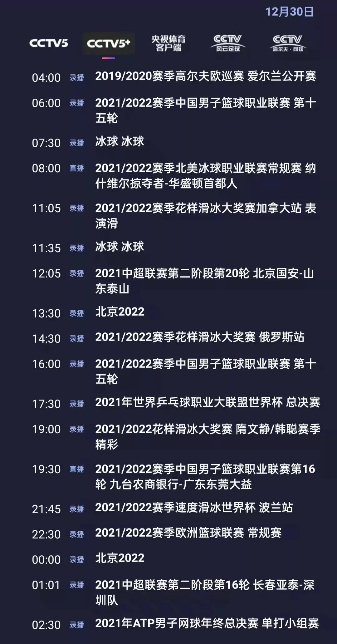 CCTV5+19:302021/2022赛季中国男子篮球职业联赛-第16轮(九台农商银行-广东东莞大益)。21:45实况录像-2021/2022赛季速度滑冰世界杯波兰站 精选2。