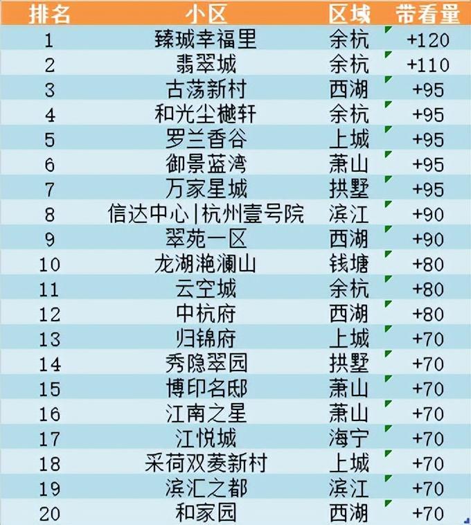 受到五一假期的影响,上周我爱我家和贝壳平台的带看量均有下降。带看热的小区仍以次新房小区为主,如幸福里、和光尘樾、壹号院、嘉品等。而市中心的老小区仅有古荡新村、翠苑一区和采荷双菱新村上榜。