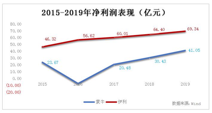 此后,2017-2019年蒙牛的净利才表现出稳中有升的态势。反观伊利,自2015年起,净利润表现就及其稳定,且大幅高于蒙牛。