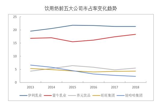 在国内头部企业份额相对集中的情况下,伊利市场份额仍然高于蒙牛。乳制品市场在2018年时,市占率分别达到16.2%以及12.7%。饮用奶市场也依然处在遥遥领先状态,截至2018市占率分别达到21.3%以及18.3%。