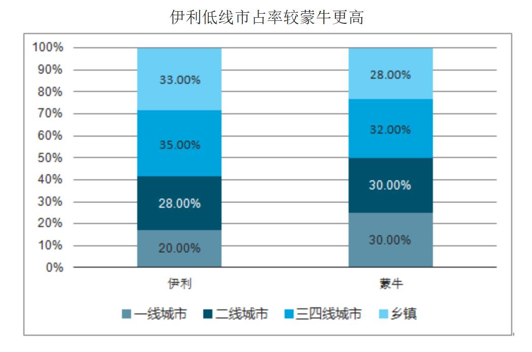 据中国产业信息网资料显示,目前,伊利在三、四线及乡镇市场的渠道占比达到 40%,蒙牛为 36%。与此对应的, 伊利在三、四线及乡镇市场的市占率达到 33%-35%, 而蒙牛则为 28-32%。
