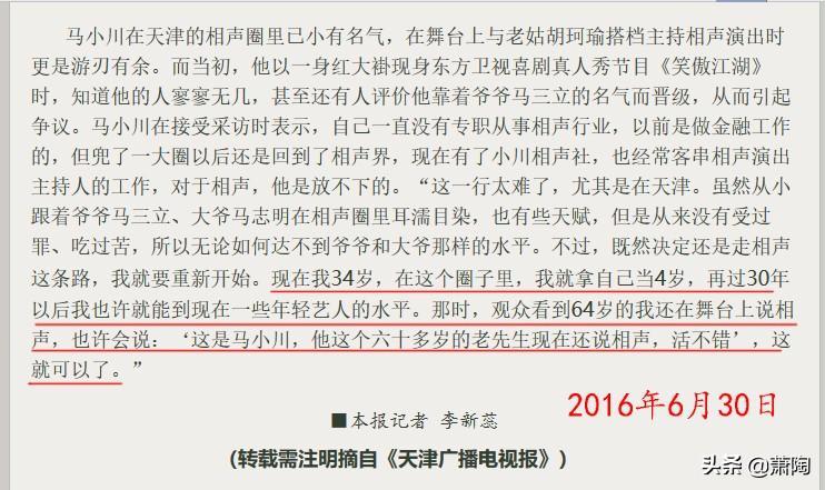 节目播出后,网上的负面评价更是铺天盖地。用马小川自己的话说“没跨过去,掉沟里了”。其实,马小川有自知之明,知道自己几斤几两。2016年,在接受天津一家媒体的采访时,马小川说过这样的话:“再过30年以后我也许就能到现在一些年轻艺人的水平。”