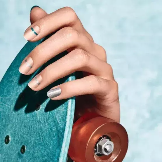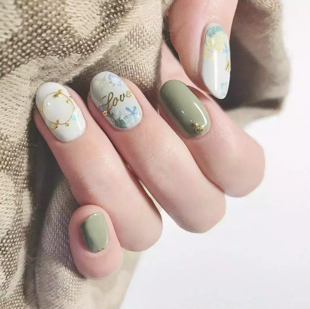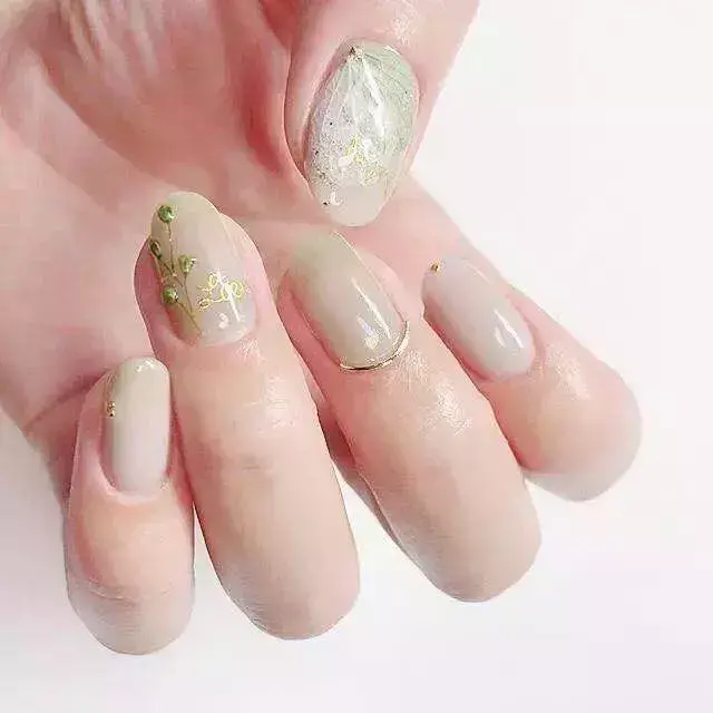 薄荷绿加上大地色,特别适合创作田园系的美甲,在大地色的甲面上用薄荷色和金色做局部勾花,而薄荷色则以跳色出现。