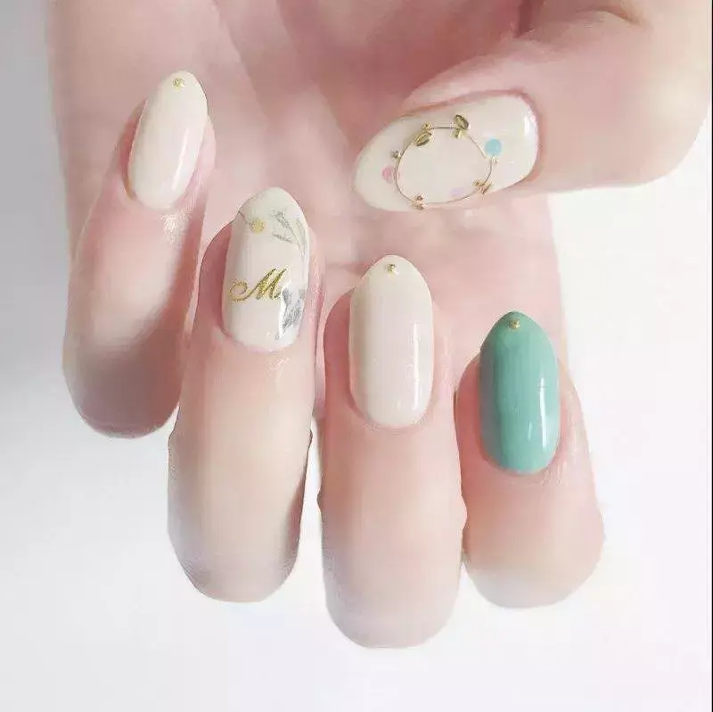 从上面的配色来看,只要往薄荷色里加一点大地色或者灰色调,整双手的色调就会变得自然又柔和。