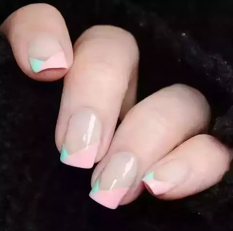 还是浅色调的薄荷色,但是这次加入了一些浅浅的嫩芽黄,它本来就和薄荷色是相近色,这样可以增加颜色的层次感,渐变的效果会削弱颜色对肤色的影响。