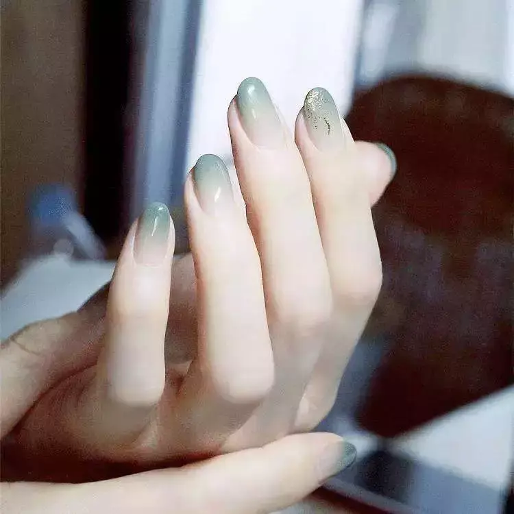 相比浅色,深一点的薄荷色反而对黄皮比较友好,但是不要让高饱和度充满整个甲片,你可以从图谱中选择两三个过渡色分区涂抹,看起来更高级。
