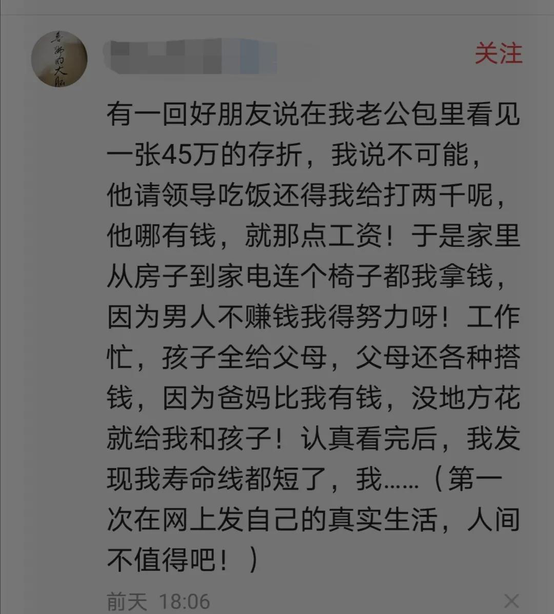 有点搞笑的一条评论来自一个妻子:“有一回朋友说在我老公包里看见一张45万的存折,我说不可能,他请领导吃饭还得我给转钱呢,他就那点工资,家里从房子到家电连个椅子都我拿钱。工作忙,孩子全给我父母,父母的钱没地方花就全给我和孩子。看完你发的,我发现我寿命线都短了,人间不值得啊。”