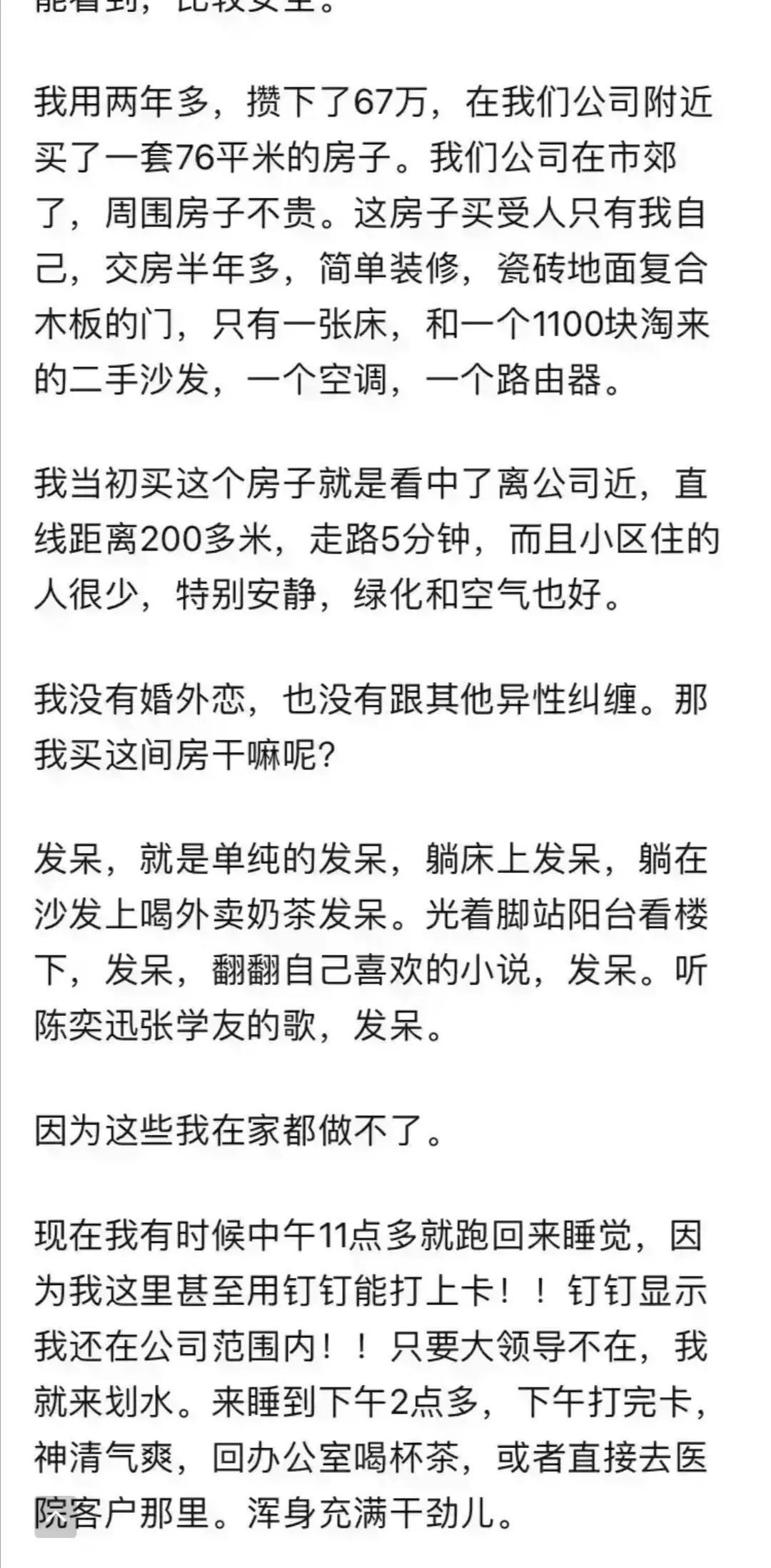 “发呆,就是单纯的发呆,躺床上发呆,躺在沙发上喝外卖奶茶发呆。光着脚站阳台看楼下,发呆,翻翻自己喜欢的小说,发呆。听陈奕迅张学友的歌,发呆。因为这些我在家都做不了。这种感觉很美妙,只有在这里才感觉到真正的放松,而且自己像拥有了一个秘密基地一样,每次锁门开门都有种难以言表的刺激感,堪比偷情。我没把这件事告诉任何人,包括我最好的兄弟和同事。”