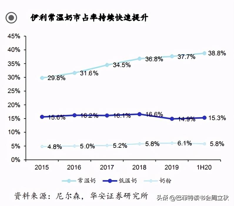 伊利股份的2020年上半年低温奶市占率为15.3%,三季度为15.2% ,低温酸奶增长较为乏力,与蒙牛相比,伊利的低温奶发展还是比较滞后的。