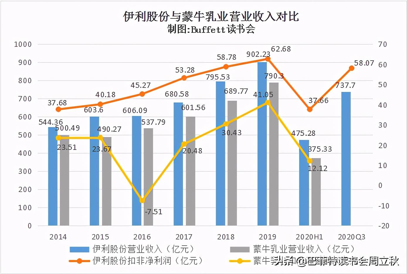 2020三季度伊利股份实现营业收入737.7亿元,同比增长7.4%,扣非净利率58.07亿元,同比增长10.3%;