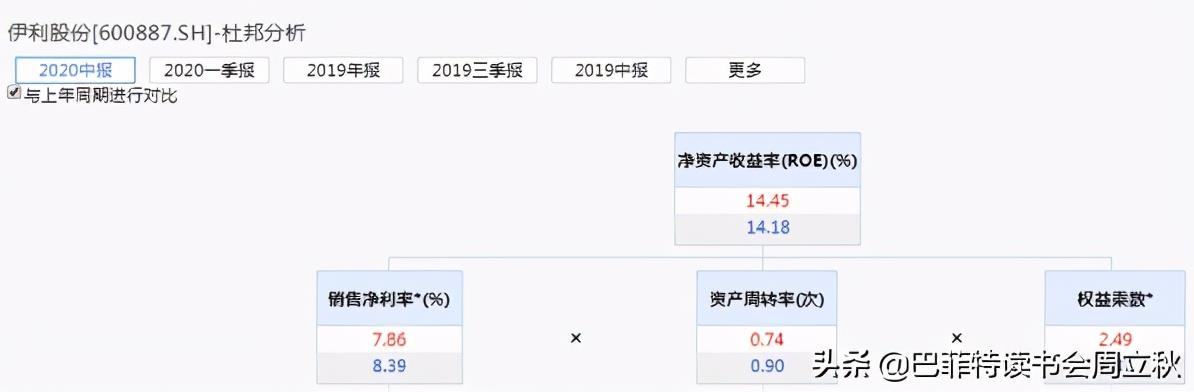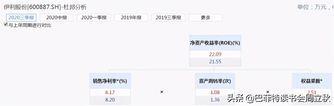 伊利股份2020年上半年和三季度净资产收益率同比都有小幅度上升,但都是由于权益乘数的上升引起的,销售净利率和资产周转率都是有下降的。