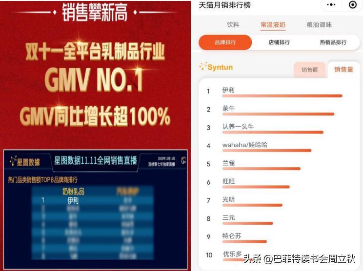 在去年的双十一中,伊利股份在天猫、京东、淘宝全线落后蒙牛后,在奶粉乳品行业中,国产乳制品龙头企业蒙牛乳业和伊利股份分别位列三四位。“双十一”当天,蒙牛的全网销售额超2亿,同比增长超过40%。