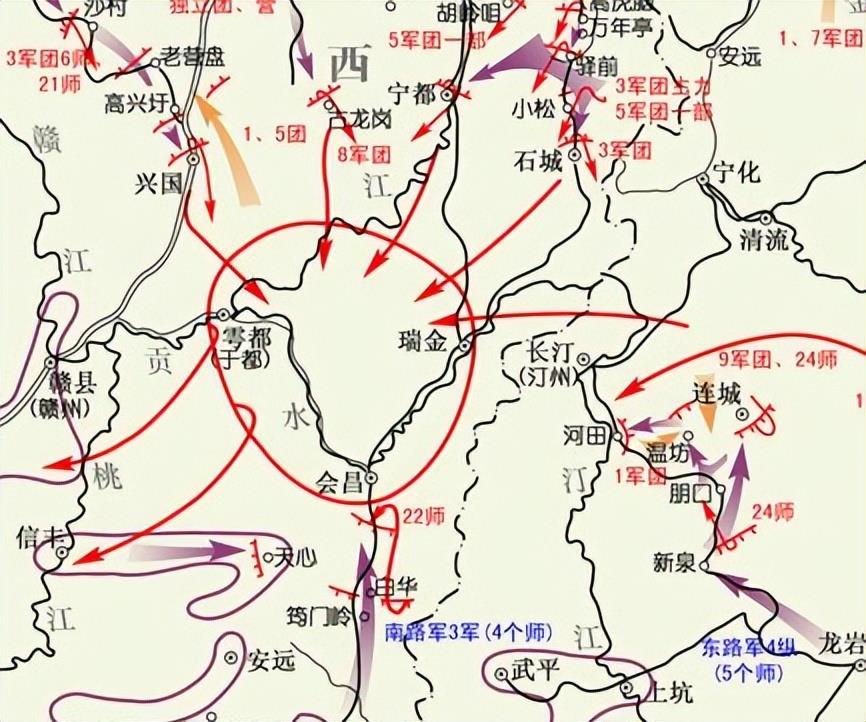 其中,北路军下辖第1、第2、第3路军,计33个师又3个旅,总司令顾祝同。具体部署:第1路军4个师又2个旅位于吉水、新淦、永丰、乐安、宜黄地区;第2路军6个师位于金溪、腾桥、崇仁地区;第3路军18个师又1个补充旅作为北路军的主力军,集结于南城、南丰、临川地区。南路军下辖11个师又1个旅,总司令陈济棠。西路军下辖9个师又3个旅和浙赣闽边守军5个师又4个保安团,总司令何键。东路军以第19路军6个师又2个旅为主,总指挥蔡廷锴。