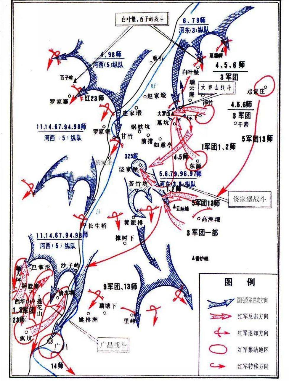 中共中央在红军连续作战、十分疲劳、减员很大的情况下,以红1、红3、红9军团及红5军团第13、第23师共9个师的兵力,采取集中对集中、堡垒对堡垒、阵地对阵地的“正规战”,以求阻止国民党军进占广昌。