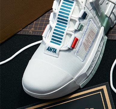 在这双安踏先进球员实战篮球鞋的鞋带系统部分,安踏做了一个从鞋带系统顶端一直延伸到球鞋的鞋舌外部的长条设计,在这个长条的两端,分别设计有安踏的品牌logo。