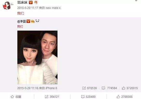 在2015年5月29号,李晨官宣了这件事情,并配上了俩人的亲密合照,紧随着范冰冰就转发了这条动态并配上了“我们”二字,看来是俩人心照不宣,从此公开承认了两人的恋情。