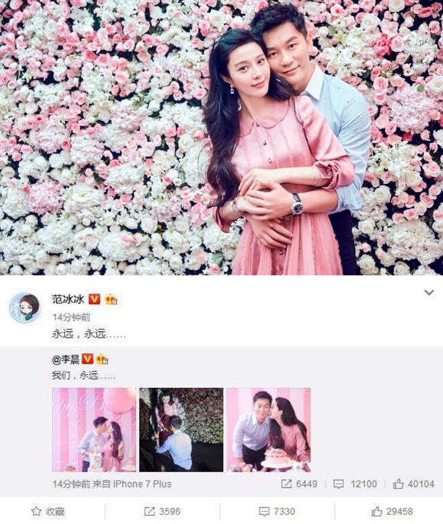 在这年范冰冰过生日那天,李晨借机求婚范冰冰,俩人晒出了很多甜蜜的照片,包括李晨单膝下跪求婚照,范爷还发文“永远,永远.......”