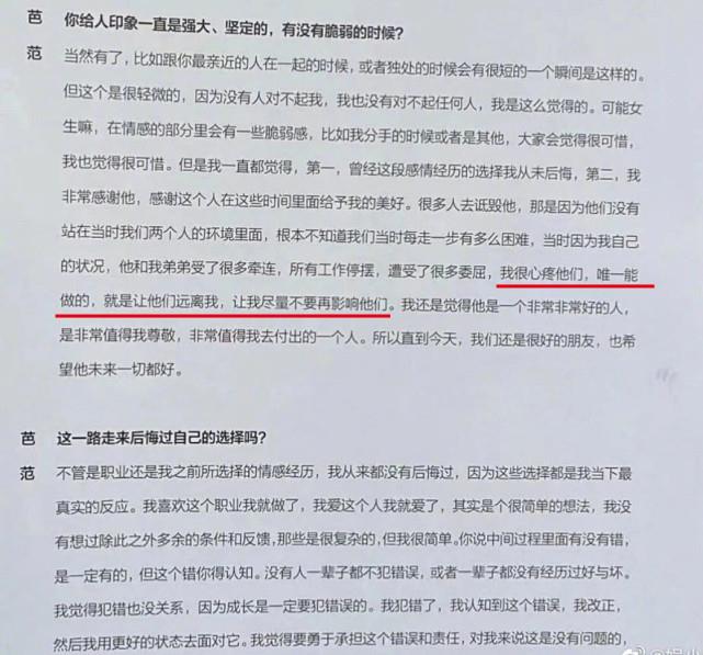 从这段话中可以看出他们的分手或许是真的因为范冰冰不想再拖累他,在采访中范冰冰还说道他是一个好人,非常值得我去尊敬,值得我去付出的一个人,看来范冰冰曾经还是很看好李晨的,对于这段感情还是很用心的。