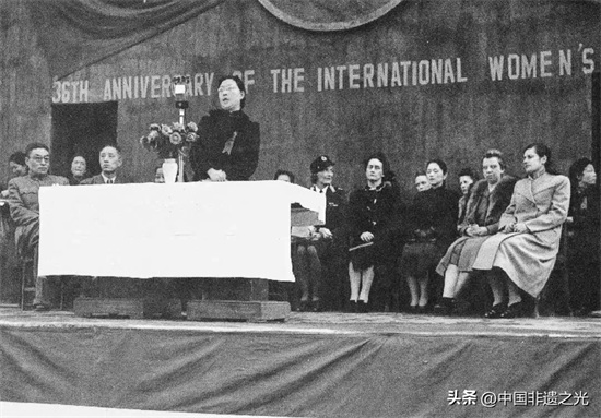 ▲20世纪40年代,重庆举行国际妇女节36周年庆祝活动。讲话者为妇女咨询总会(Women's Advisory Council)王张薇拉。后坐者左起:蒙巴顿夫人、西摩尔大使夫人、外交部副部长吴国璋夫人。