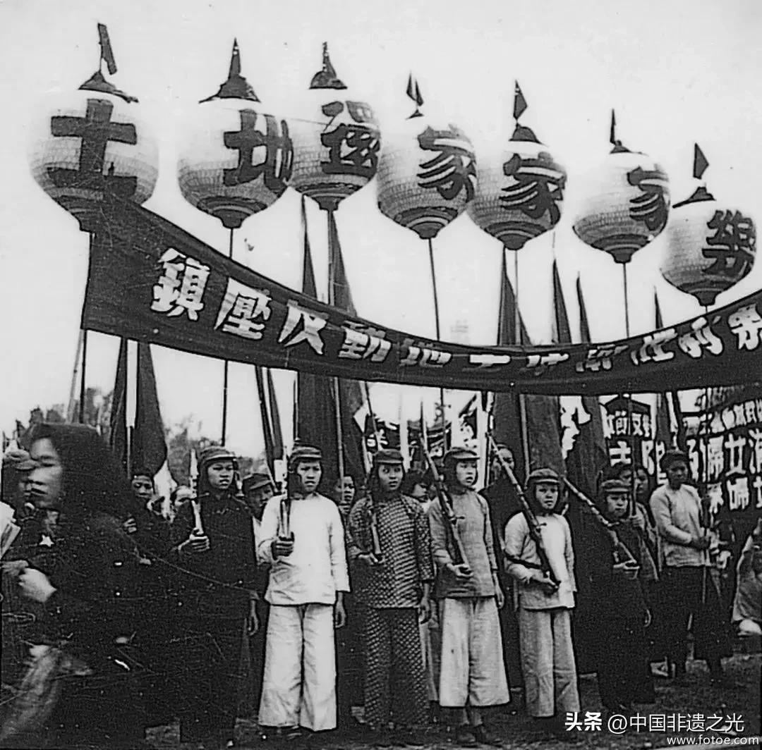 ▲1951年“三八”妇女节,广州市郊区的女民兵队伍。队伍上方的灯笼上写着“土地还家家家乐”,横幅上书“镇压反动地主”等口号。