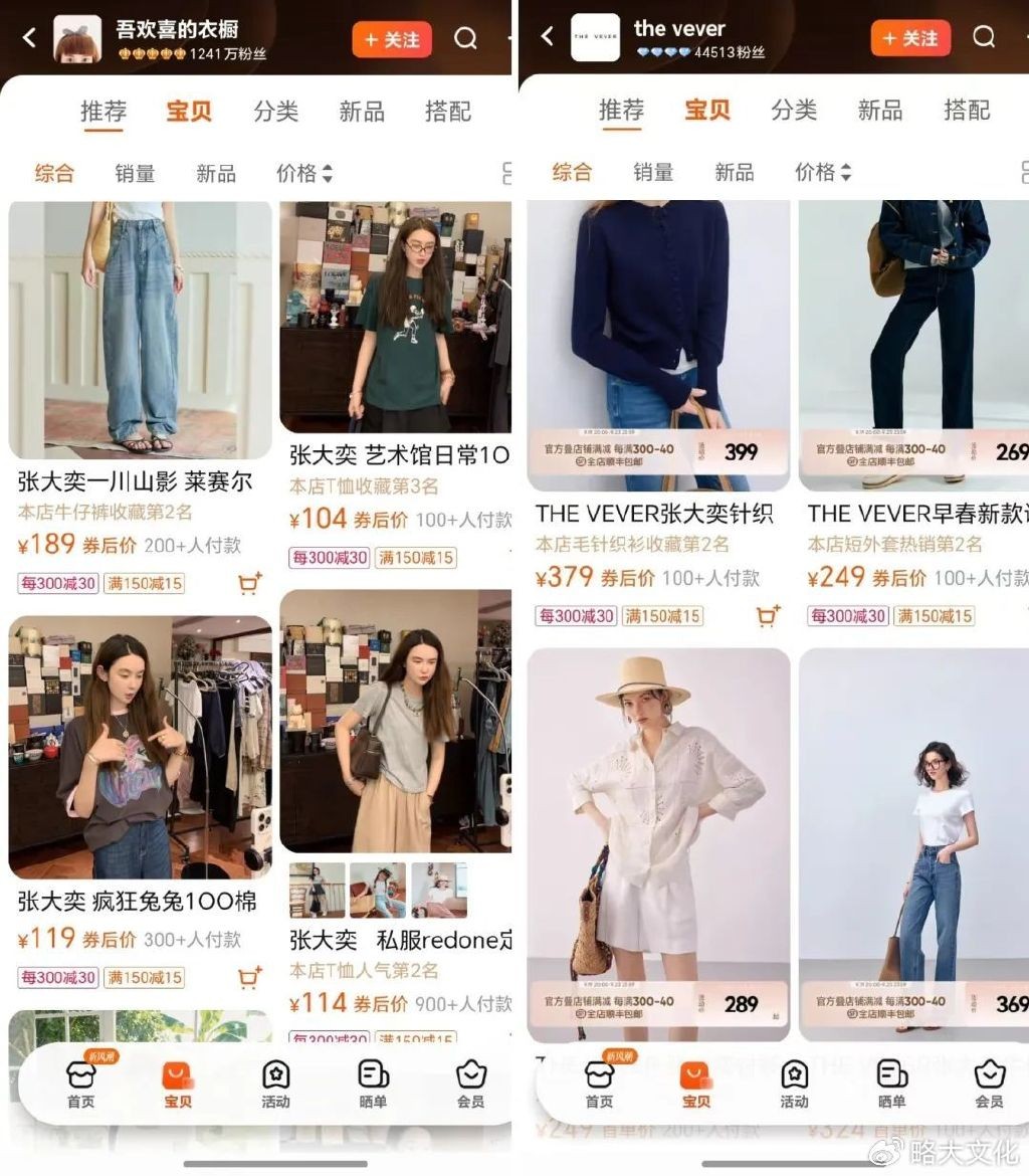 她依然守着淘宝店铺大本营。在这里积累的千万粉丝成绩,并没有复制在其他平台。她在抖音、小红书等平台的粉丝量,皆小于50万。