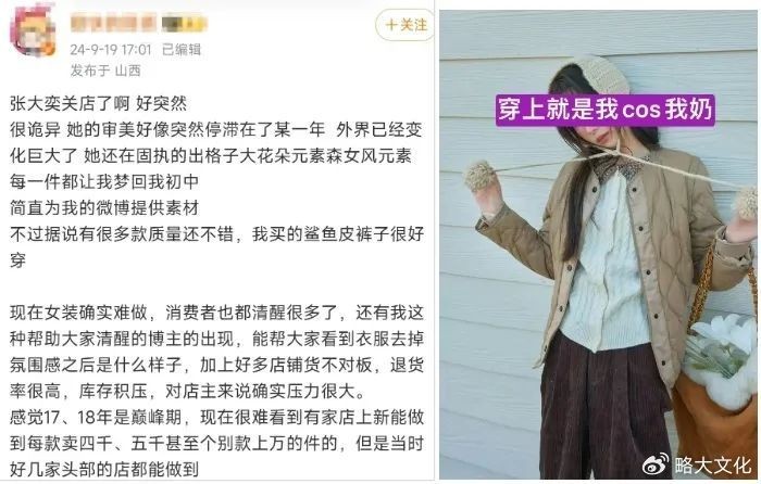 某穿搭博主表示,张大奕的审美好像停止在某一年。“外界已经变化很大了,她还固执的出格子大花朵元素森女风元素,每一件都让我梦回初中”。配图还有“穿上就是我cos我奶”的大字。