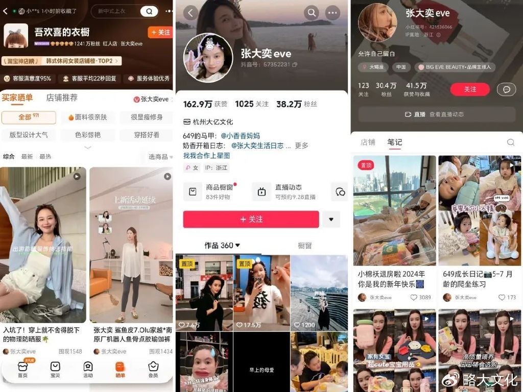 图:张大奕淘宝、抖音、小红书等平台主页截图
