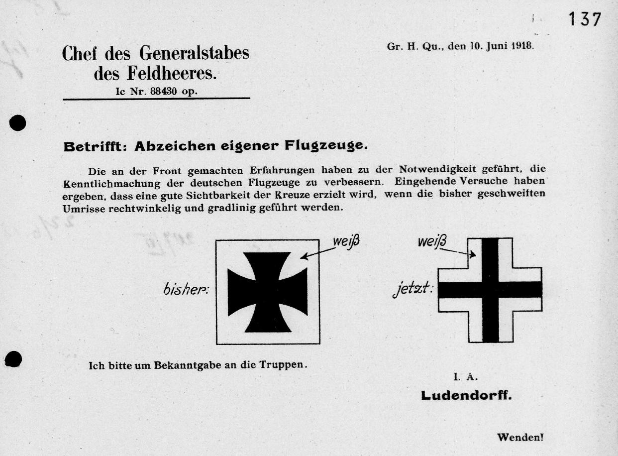 1918年3月20日德军向所有飞机制造商发布命令,从1918年4月15日开始在所有德军飞机上画上横臂十字来提高飞机识别度。横臂十字因此成为当时德国航空军团官方识别符号,并一直使用到了1918年11月一战结束。