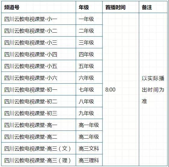 已安装四川广电网络有线数字电视的师生可以通过电视收看。在广电网络有线电视指定“四川云教电视课堂”专用频道中选择对应的年级频道观看首播;首播结束后可以进入点播/回看专区回看内容,也可以在首播时进行时移回看。频道列表如下: