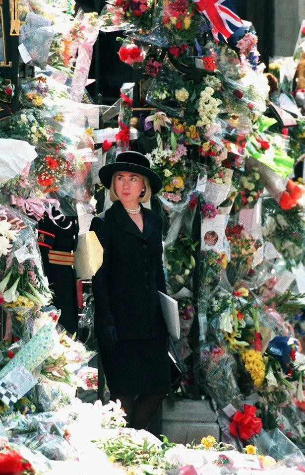 年轻时的希拉里·克林顿,时任美国总统比尔·克林顿的妻子,她被拍到观看留在教堂外的献花。