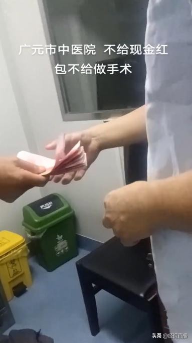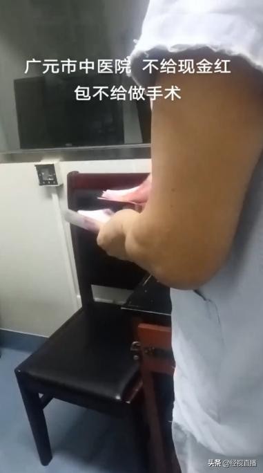 10月10日,有网友发布视频称,四川省广元市中医院一医生在手术前收取患者家属现金。视频中,这名医生在办公室内从患者家属手中接过一沓现金,清点一番后塞入了胸前的口袋,随后便离开了房间。