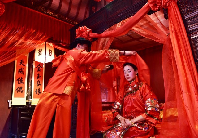 还有一个版本就是是和抢亲的传说有关,相传在某个时期,如果见到别人取老婆,看到别人的新娘又漂亮的情况之下,就可以去抢亲的,但是抢亲的人通常都是一些有权有势力的人,所以被抢亲的人都觉得好无奈,后来老百姓就想了一个办法,为了防止新娘子被抢,在结婚当日,就会在新娘子的头盖一块布,遮住脸蛋,这样就看不到,新娘子漂亮还是丑陋了,所以自古以来,盖头纱,盖红布就是这样来的了,又为了防止坏人晚上来抢亲,新郎和新娘,通常新婚之夜都不会在家里住,唯有找一个山洞来过夜,等到新婚夫妇回来之后,都生米煮成熟饭了,抢来都没意思,抢亲的人好自然就放弃了,就是因为这样,老百姓就开始将新婚之夜叫做洞房之夜。