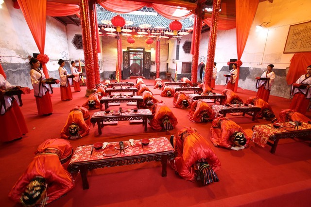 从古至今,传统的中式婚礼流程,细节上都有些小差异,但是拜的仪式基本上都相同,拜堂成亲都一定会有一拜天地,二拜高堂,三夫妻交拜,拜完之后就要送入洞房了,这样写叫做礼成。