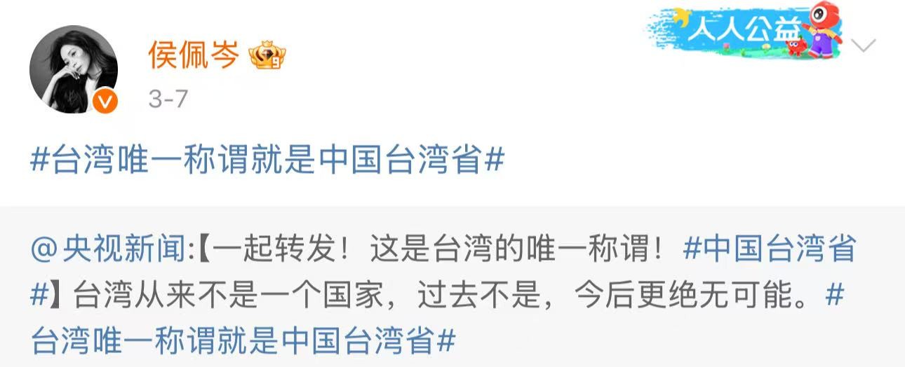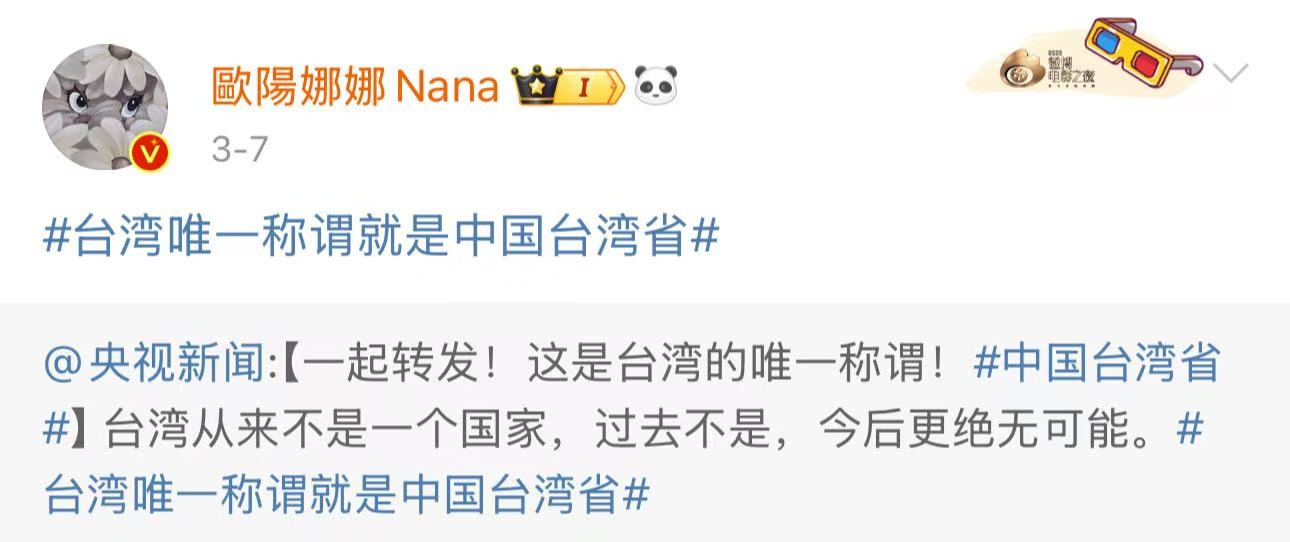 侯佩岑第一时间转发声明,即便遭岛内网友辱骂仍坚持发声;欧阳娜娜虽淡出娱乐圈,却以“祖国统一无小事”表明态度。