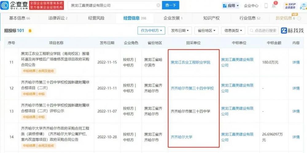 企查查显示,黑龙江嘉美建设有限公司成立于2009年7月,注册资本5000万元,实缴资本100万元,法定代表人为程某某,经营范围包含建设工程施工、住宅室内装饰装修等。招投标信息显示,该公司曾中标多个学校工程项目。