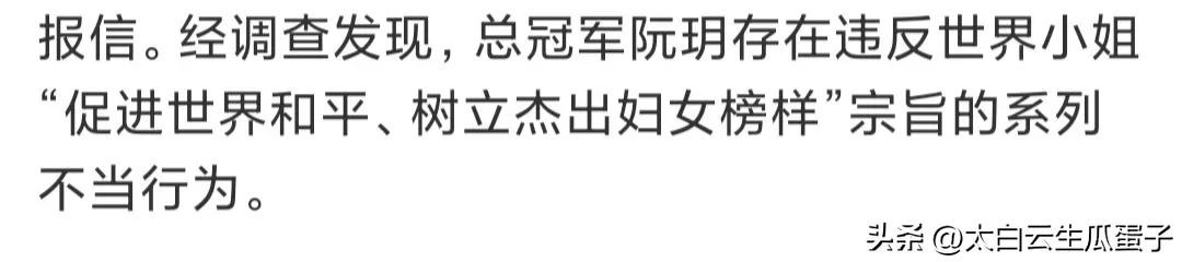 通告中专门写到“经调查发现,总冠军阮玥存在违反世界小姐“促进世界和平、树立杰出妇女榜样”宗旨的系列不当行为。因此决定取消阮玥选手在第71届世界小姐中国区赛事中所取得的全部荣誉,禁止其使用比赛的任何头衔。