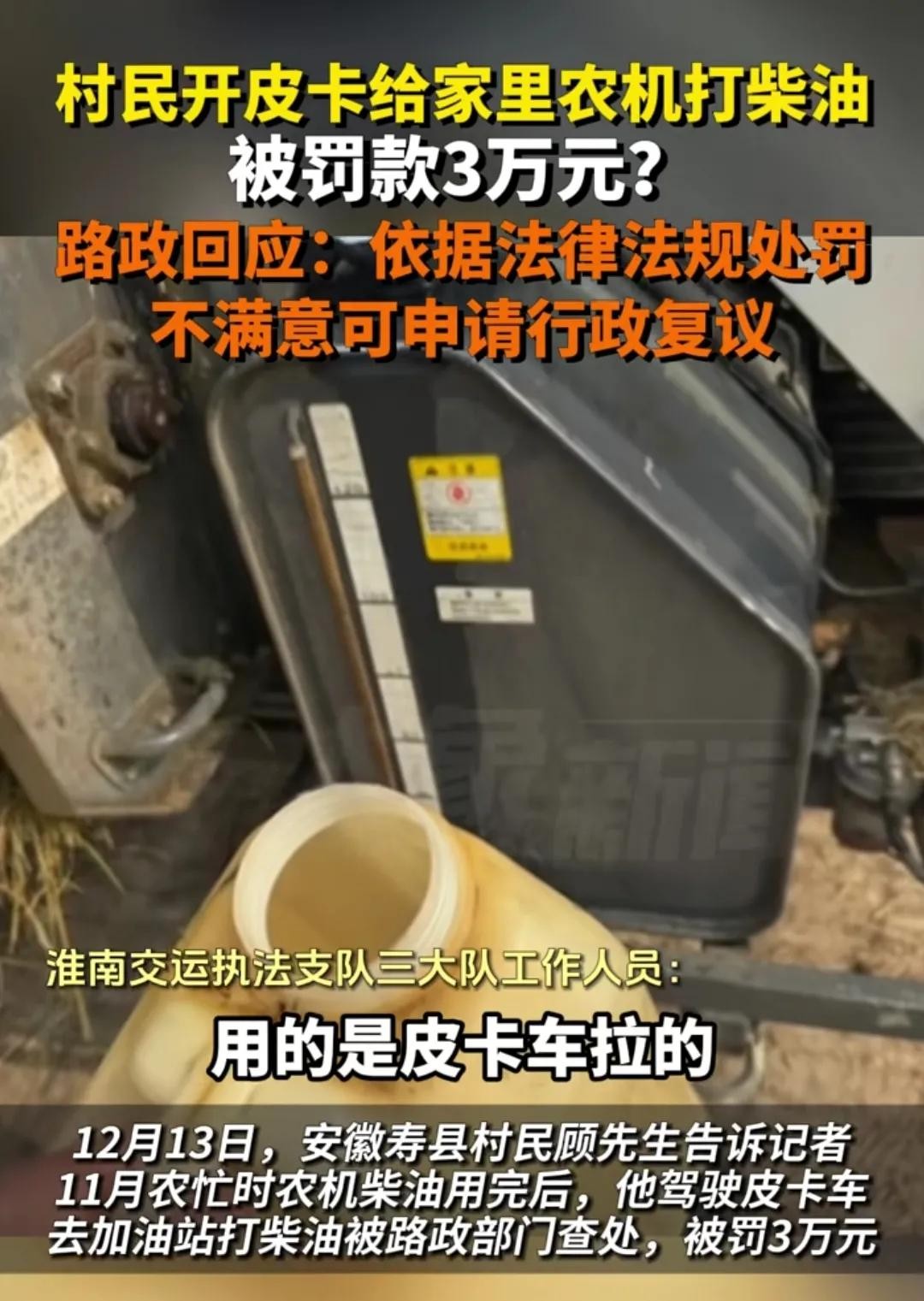 顾先生在运输柴油过程中,因涉嫌非法运输危险品被路政部门查处,面临罚款。然而,顾先生所在的村委会出具了盖章证明,证明柴油是用来给农机加油的,加油站工作人员也证实了此事。但在铁面无私的路政部门面前,这些证据显得苍白无力。顾先生对此表示不满,认为执法部门执法不公,准备申请行政复议。