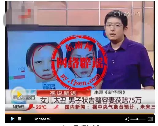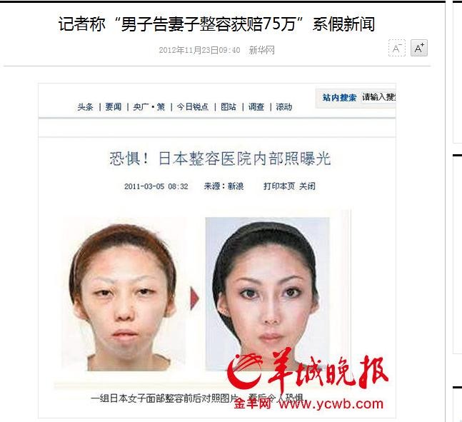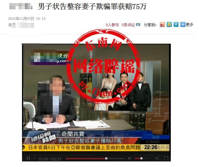 据新华网2012年11月发布文章《记者称“男子告妻子整容获赔75万”系假新闻》进行辟谣。文章指出:照片来自日本整容医院,并无这场官司,离奇新闻原发地在黑龙江,仅是一起普通的夫妻纠纷被炒作。