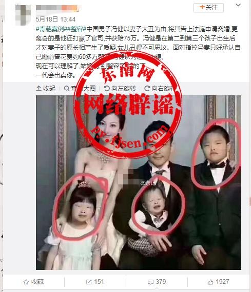近日,有网友发文称:“中国男子冯健以妻子太丑为由,将其告上法庭申请离婚,更离奇的是他还打贏了官司,并获赔75万。冯健是在第二到第三个孩子出生后才对妻子的原长相产生了质疑,女儿丑得不可思议。面对指控冯妻只好承认自己婚前曾花费约60多万整容,冯健认为这是诈骗。现在可以理解了,姑娘们,别整容了,你的下一代会出卖你。”并配发一张好像是一家五人的合照。只见图片中爸爸英俊潇洒,妈妈美若天仙,身旁三个小孩却长得其貌不扬。